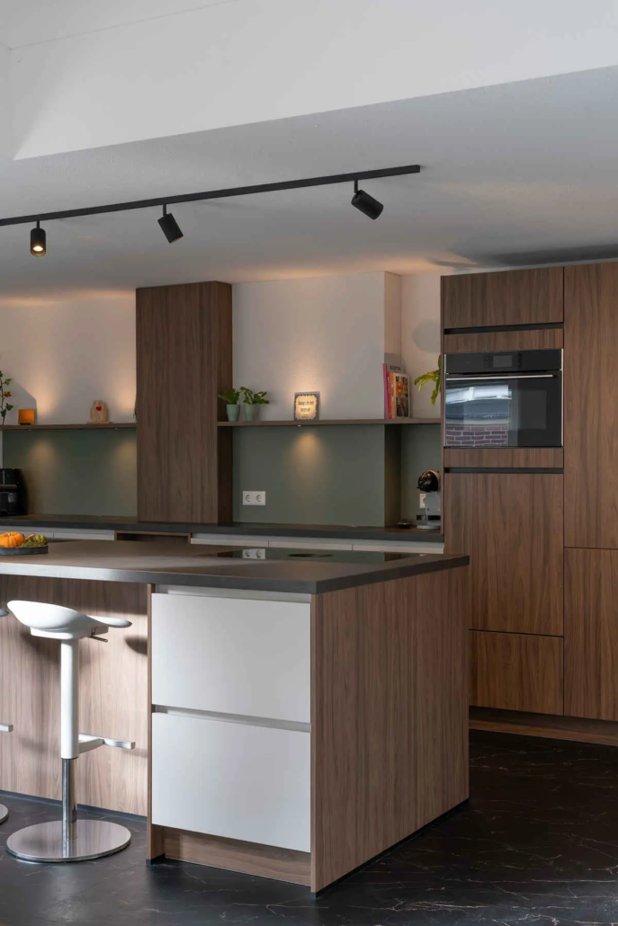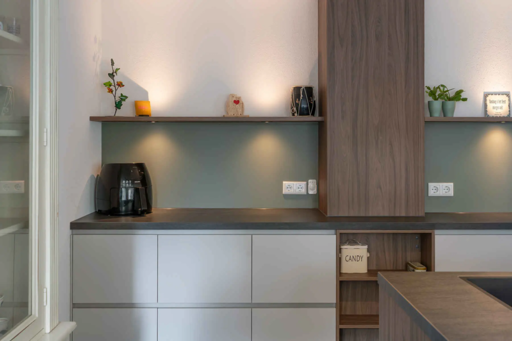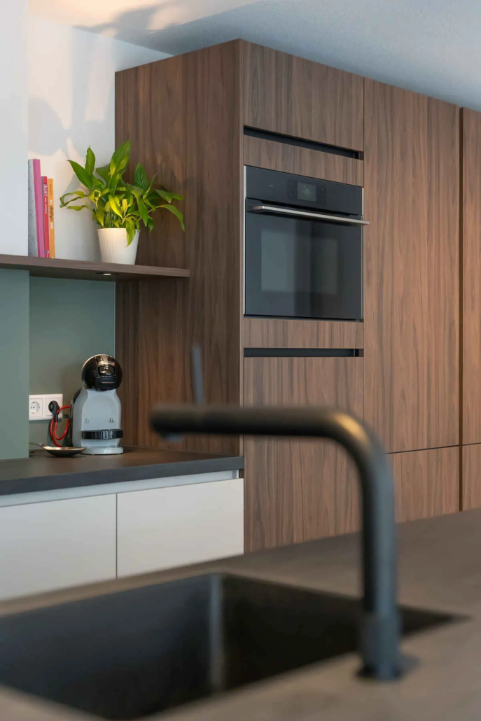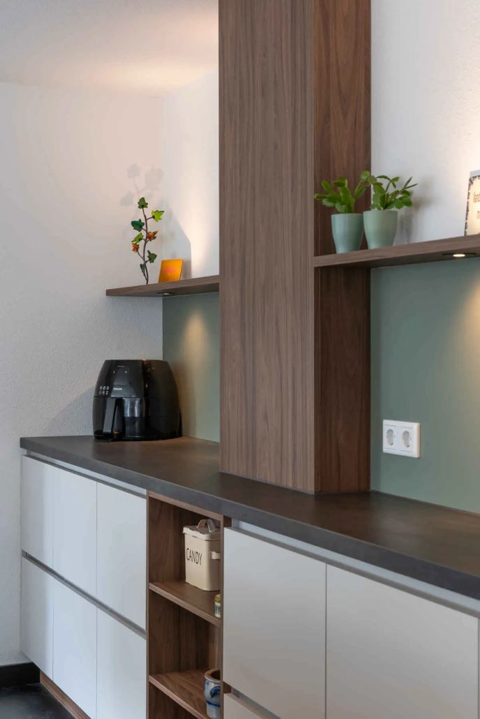 “We hadden wel een voorkeur voor de notenkleur, verder was het redelijk blanco”, legt Ragnild uit. Het werkblad en de achterwand werden later gekozen, gebaseerd op wat goed bij de rest van het interieur paste. “Het achterwandje is overschilderbaar, maar de kleur bevalt ons goed.”