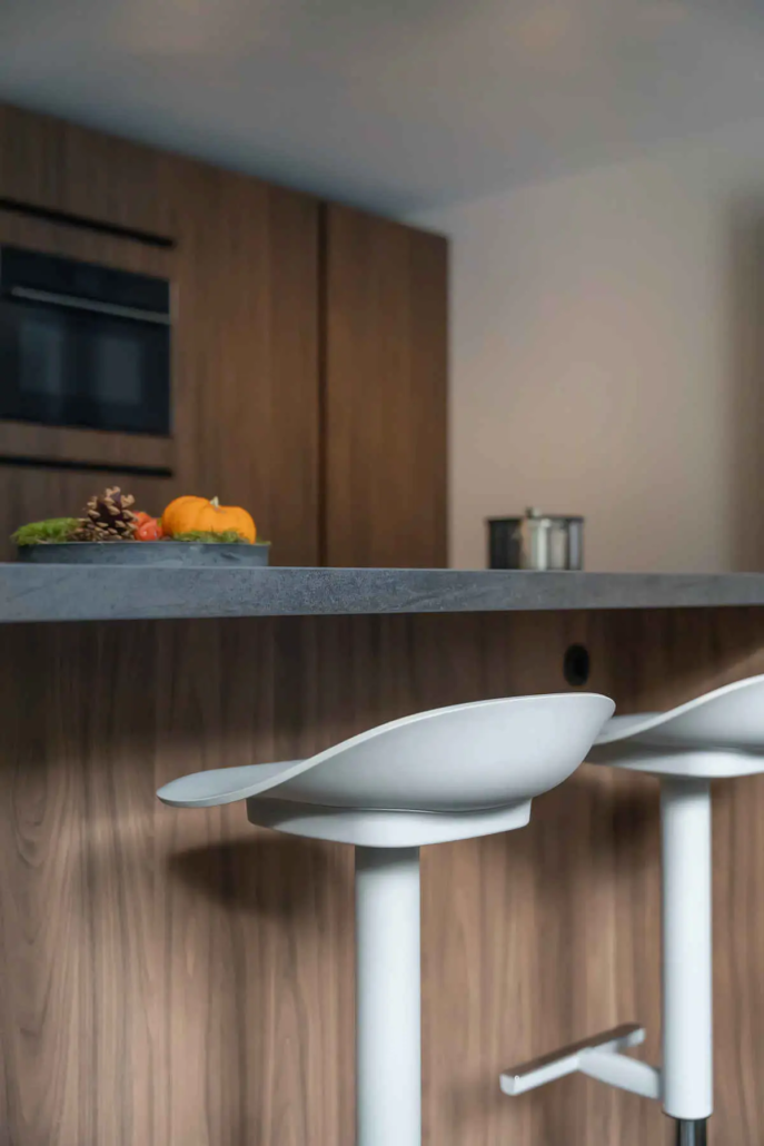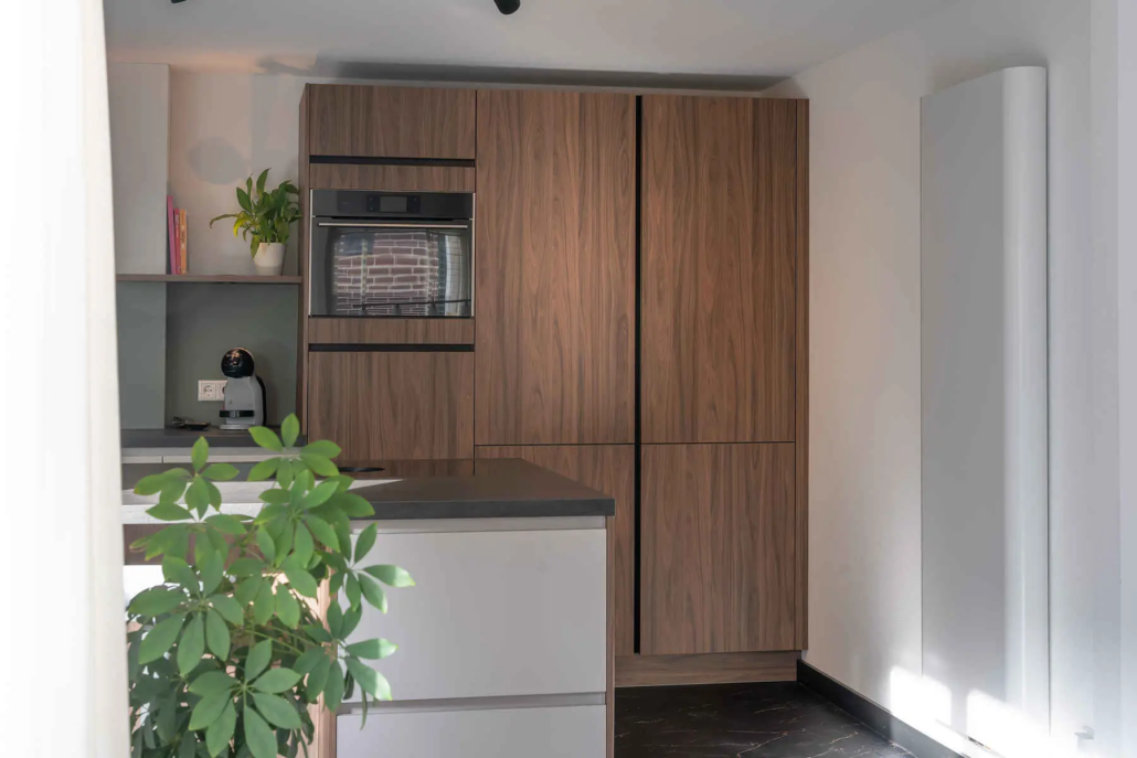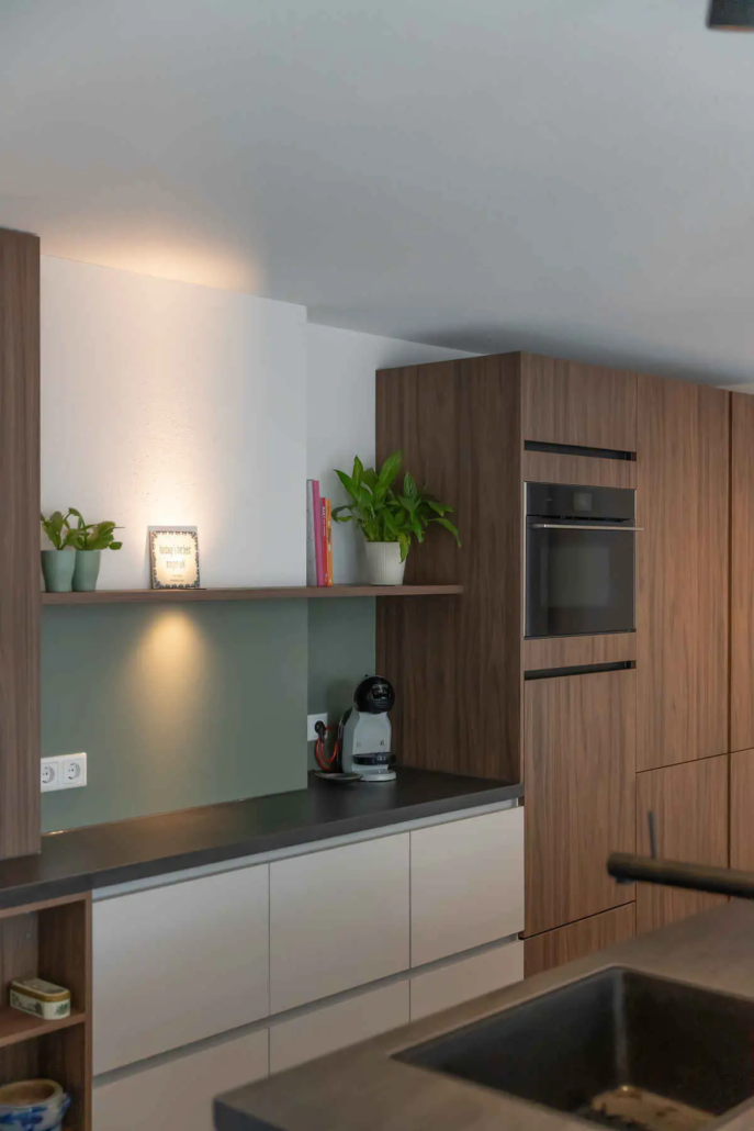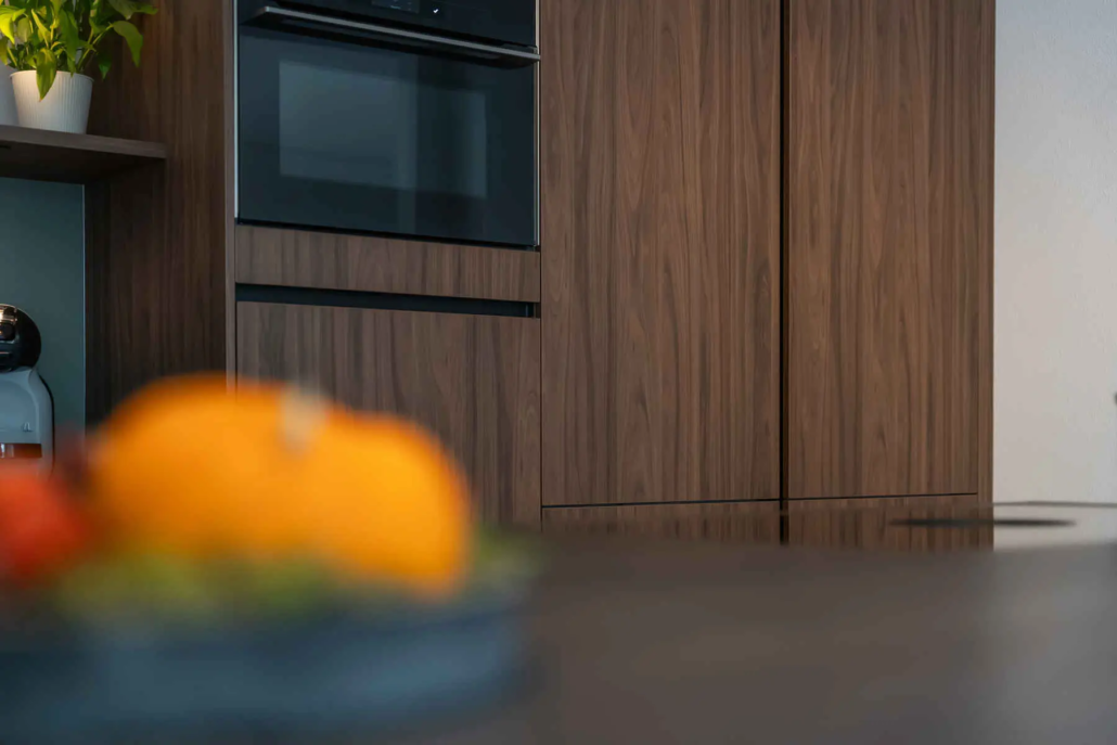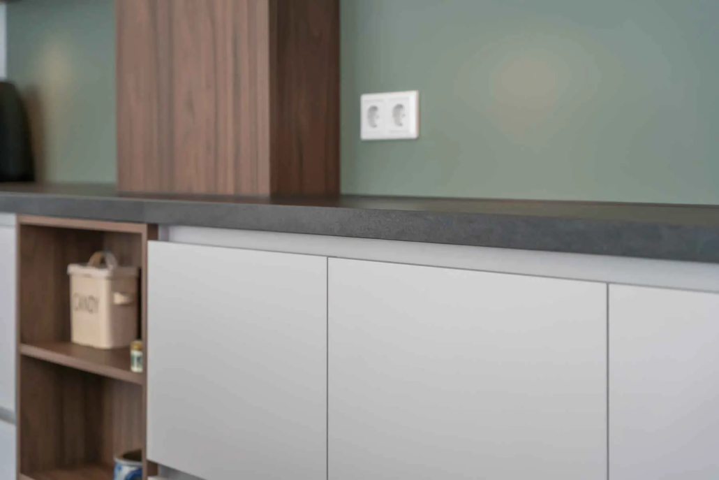 “We hadden wel een voorkeur voor de notenkleur, verder was het redelijk blanco”, legt Ragnild uit. Het werkblad en de achterwand werden later gekozen, gebaseerd op wat goed bij de rest van het interieur paste. “Het achterwandje is overschilderbaar, maar de kleur bevalt ons goed.”