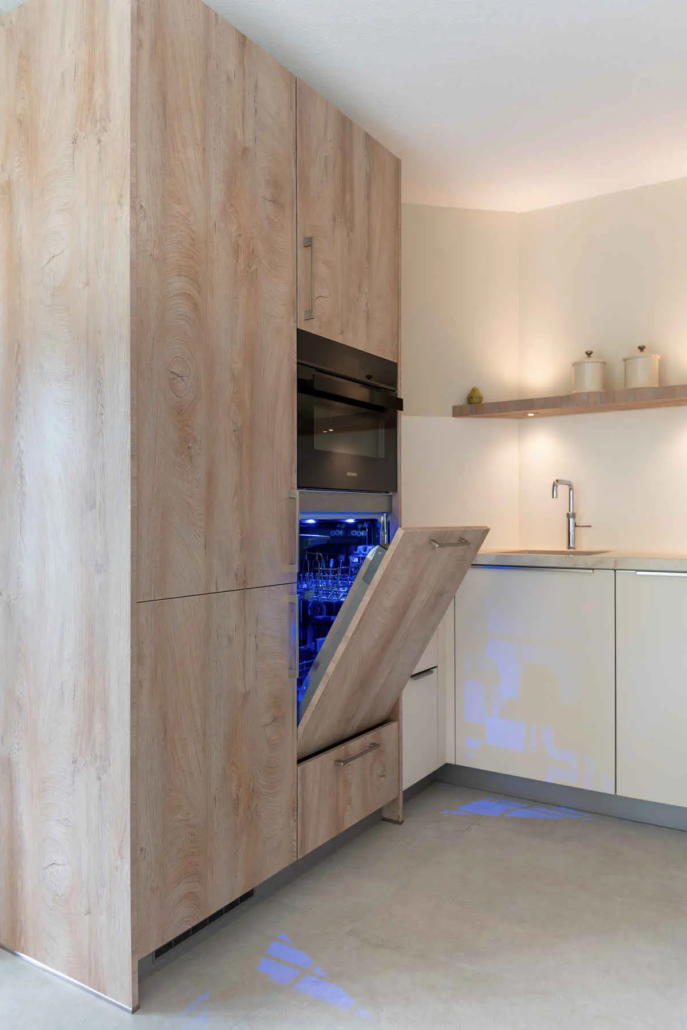 “Omdat wij al wat ouder waren, hadden wij ook de wens voor laden in plaats van kastjes. Mijn partner kon niet goed meer bukken, dus dat was belangrijk. De vaatwasser is op hoogte geplaatst en er is nu een ingebouwde afzuiging. Dat zijn allemaal pluspunten. Ik ben klein dus hoge kasten zijn niets voor mij. Nu heb ik eigenlijk alleen nog één kast boven de koelkast en daar staan dingen in die ik slechts één keer per jaar gebruik. De rest bestaat uit laden en een carrousel voor de pannen. Alles is binnen handbereik en overzichtelijk.”