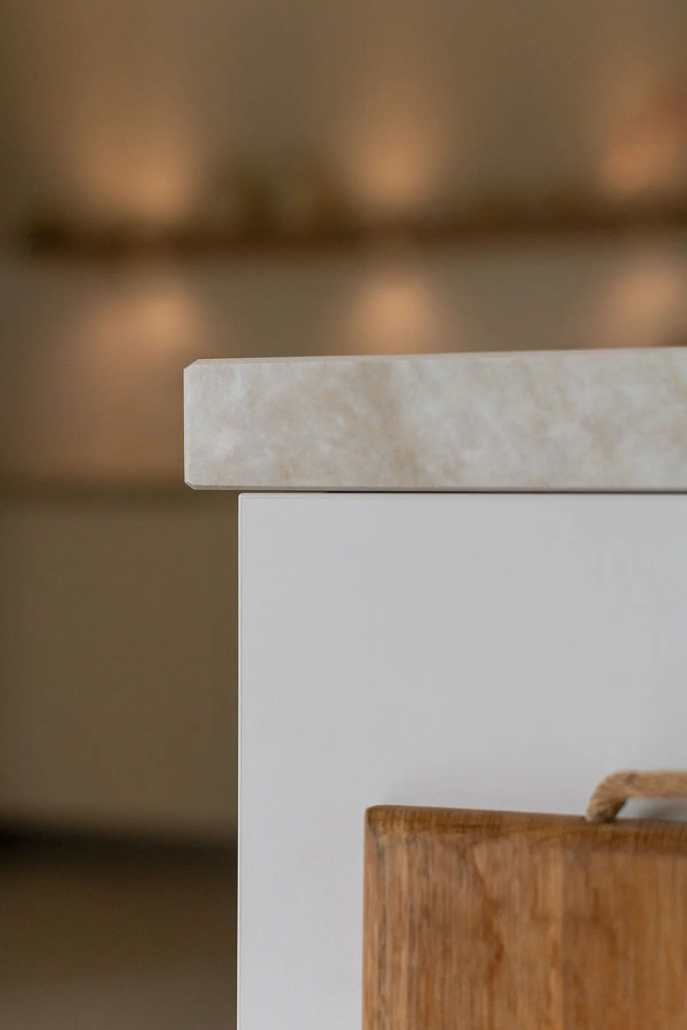 “In eerste instantie was het mijn wens om een lichtere keuken te krijgen”, vertelt Corry. “De vorige was vrij donker want er kwam maar aan één kant licht naar binnen.” Corry koos bewust voor zachte kleuren en warme tinten in de houtstructuur van de kastenwand en het aanrechtblad. “Het is echt een hele mooie, warme keuken geworden. Ik heb er een tijdje over gedaan om alles bij elkaar te zoeken, maar ik ben helemaal content met de keuken.”